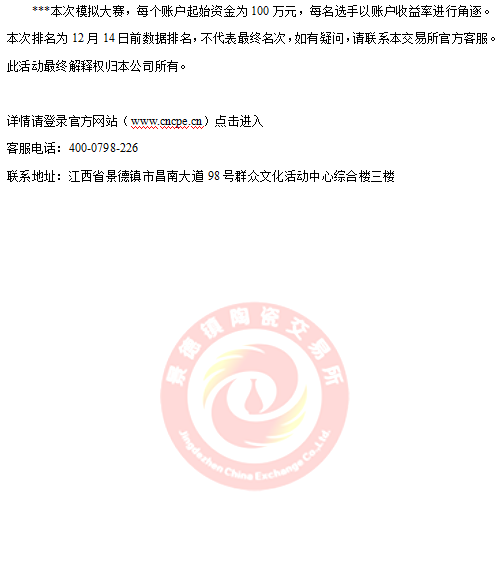 景德鎮(zhèn)陶瓷交易所首屆昌南杯模擬交易大賽10月18日火熱開賽以來,參賽人數(shù)持續(xù)攀升。通過近兩個月模擬交易大賽的鍛煉,參與模擬交易大賽的投資人會員對陶瓷藝術(shù)品投資的認(rèn)知度不斷提高,比賽也漸入佳境。截止12月14日收盤,模擬賬號"8001000001"以總收益率761.04%的成績拔得頭籌。"8001000002"以總收益451.05%的成績緊隨其后。"8001000003"以總收益388.04%成績位列第三。前二十選手的總收益也都在100%以上,值得慶賀。接下來的賽況如何,我們拭目以待!報名入口請點擊