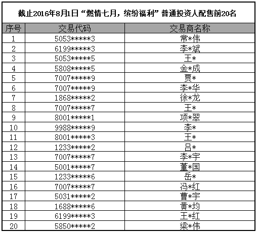 意向參與配售活動的廣大投資人可以抓緊時(shí)間積極參與,爭取更大的獲利機(jī)會。截至8月1日獲得活動配售資格的前20名投資人如下表: