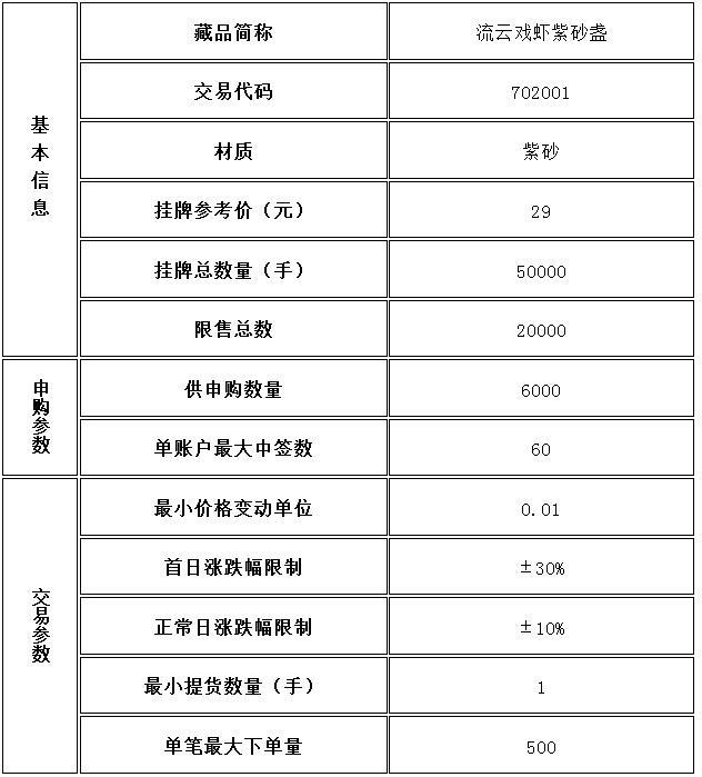 經景德鎮陶瓷交易所有限公司(以下稱本交易所)發行會員申請,本交易所專家委員會、新藏品掛牌審核小組評估審核通過,對已經完成托管入庫的藏品《流云戲蝦紫砂盞》準予在本交易所線上實物交易系統正式掛牌交易,具體事項公告如下: